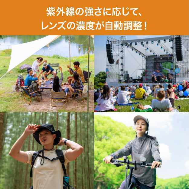 紫外線の強さに応じてレンズの濃度が自動調整されるため、屋外・屋内を移動しても、かけ替える必要なし。キャンプ・アウトドア・ドライブなど、光環境が変わるシーンでも、常に快適な視界を提供します。