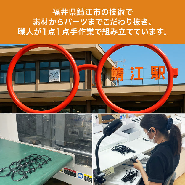 世界三大メガネ生産地「鯖江」の地で、職人さんが1点1点手作業で組み立てています。